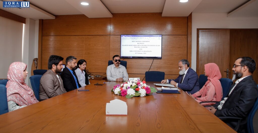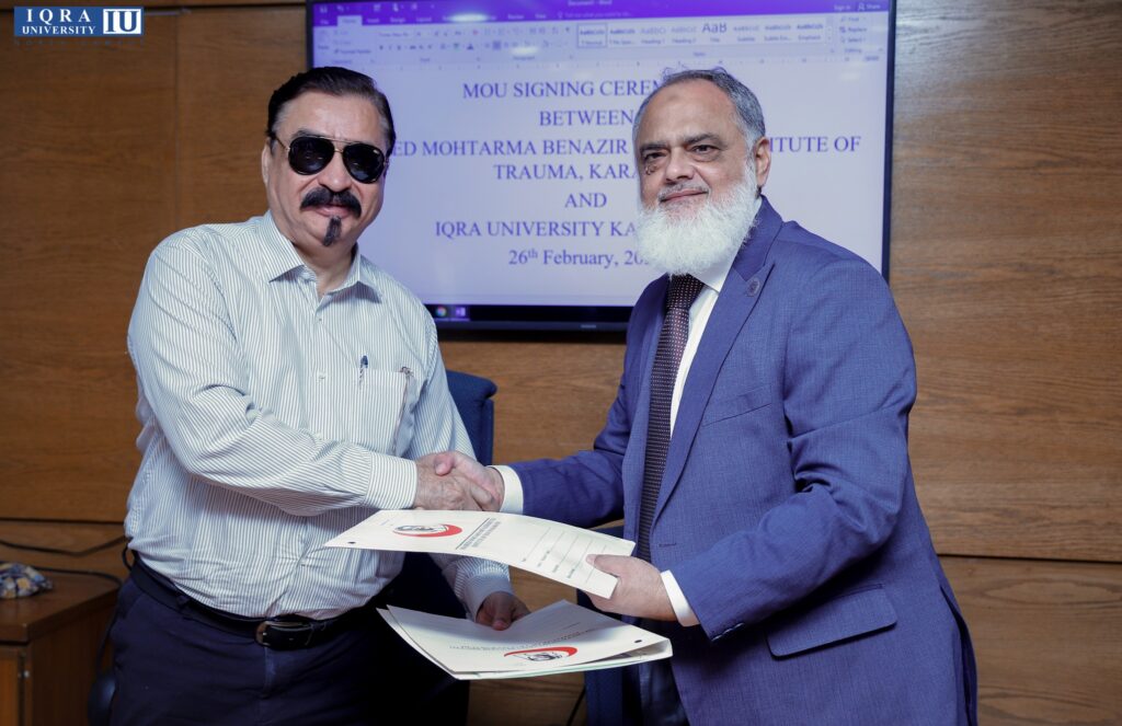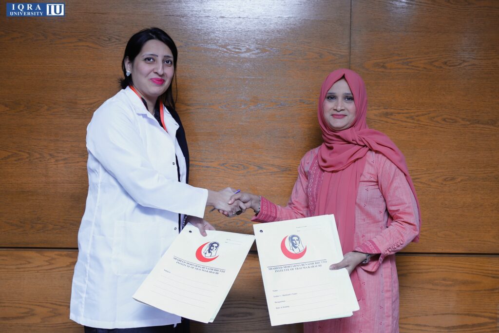 Iqra University North Campus is excited to announce the formalization of a strategic partnership with Shaheed Mohtarma Benazir Bhutto Institute Of Trauma (SMBBIT) through the signing of a Memorandum of Understanding (MOU). This collaborative endeavor underscores a joint dedication to advancing healthcare standards and fostering innovative research. It is the commencement of a cooperative journey with a focus on enhancing medical services and contributing to the community’s well-being. The partnership encompasses diverse initiatives, including research collaboration, student clinical rotations, joint education programs, and professional training workshops, highlighting the comprehensive scope of collaboration between the two institutions.