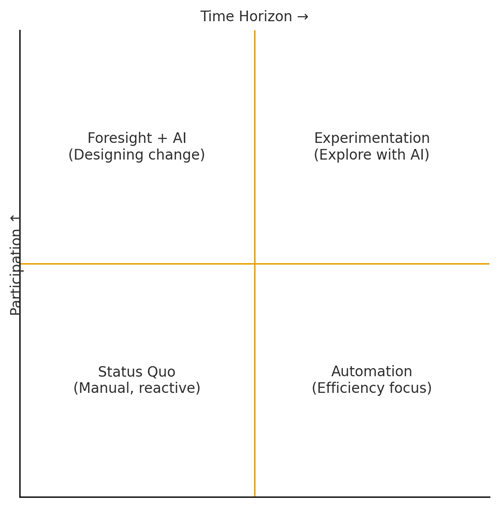 Figure 1: Pairing participation with time horizon shows how combining foresight with AI moves learners from simple automation to designing change.